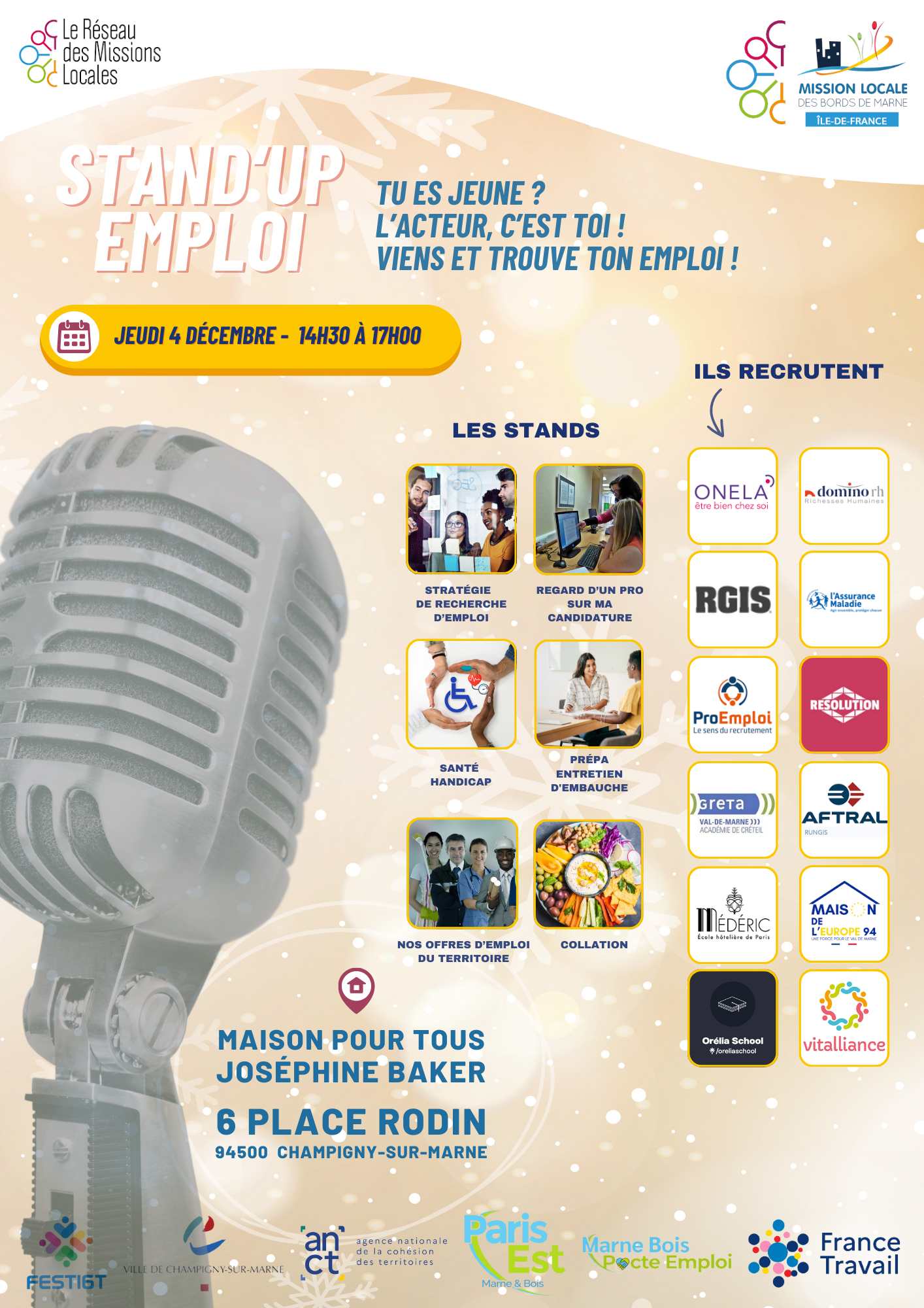 La Mission Locale des Bords de Marne organise sa 10ème édition du Stand'Up de l'Emploi le jeudi 4 décembre, de 14h30, à 17h , à la Maison pour Tous Josephine BAKER.